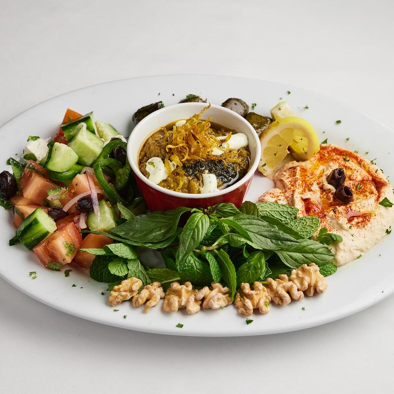 Dolma, Kashi Bademjan, herbs, feta cheese, olives, hummus, cucumber, and tomatoes.