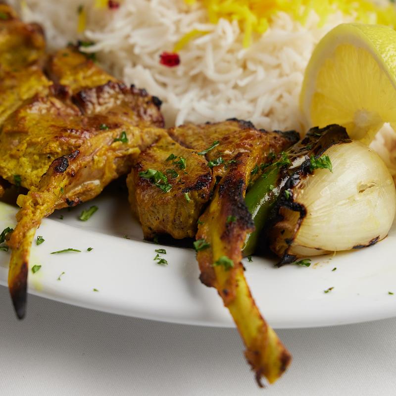 Skewer of filet of lamb marinated with yogurt & saffron with grilled onion.