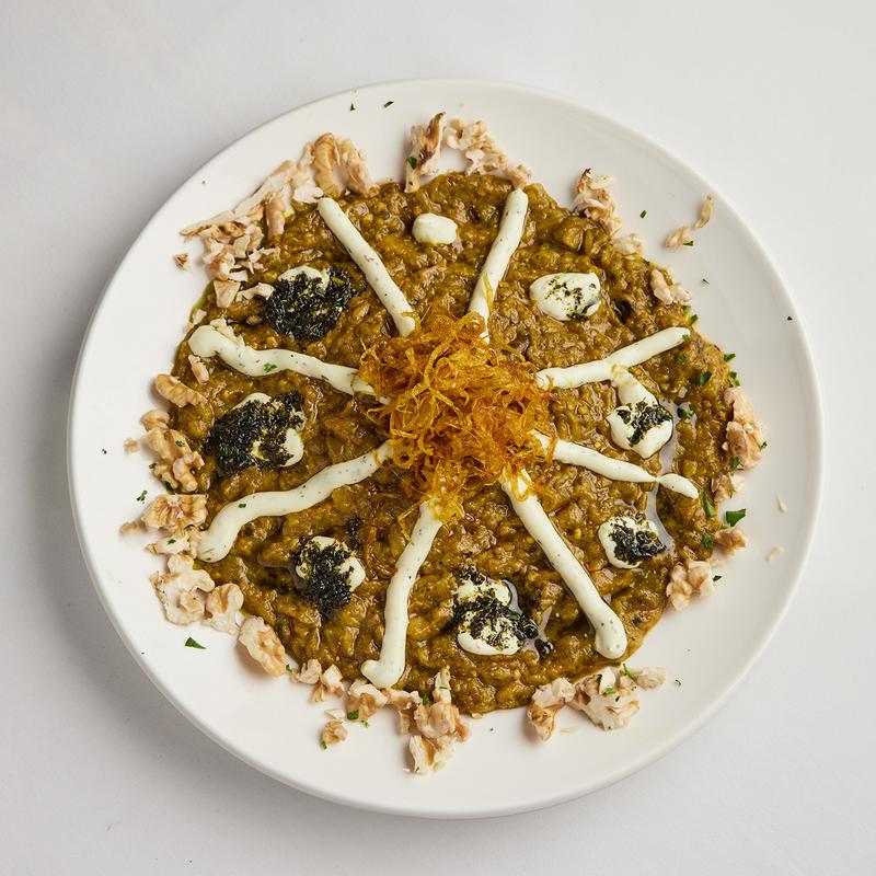 Finely crushed roasted walnuts simmered in pomegranate sauce with a choice of mini beef meatballs or tender chicken.