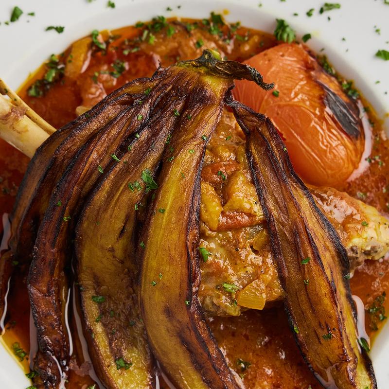 Roasted eggplant braised in saffron tomato broth with lamb shank.