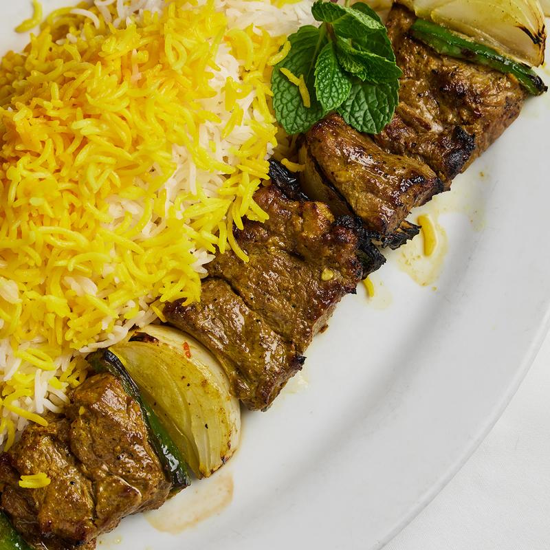 Filet mignon with onions & green peppers marinated in yogurt, olive oil, and saffron.